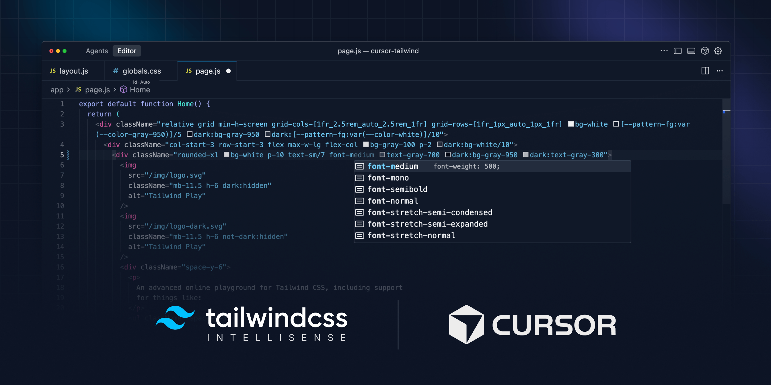 Cursor 是一款原生 AI 代码编辑器,具有上下文感知自动补全和内置编码助手等功能。由于它支持 VS Code 扩展,你已经熟悉的所有 Tailwind CSS 工具都可以直接使用——包括我们官方的 Tailwind CSS IntelliSense 扩展和用于类排序的 Prettier 插件。